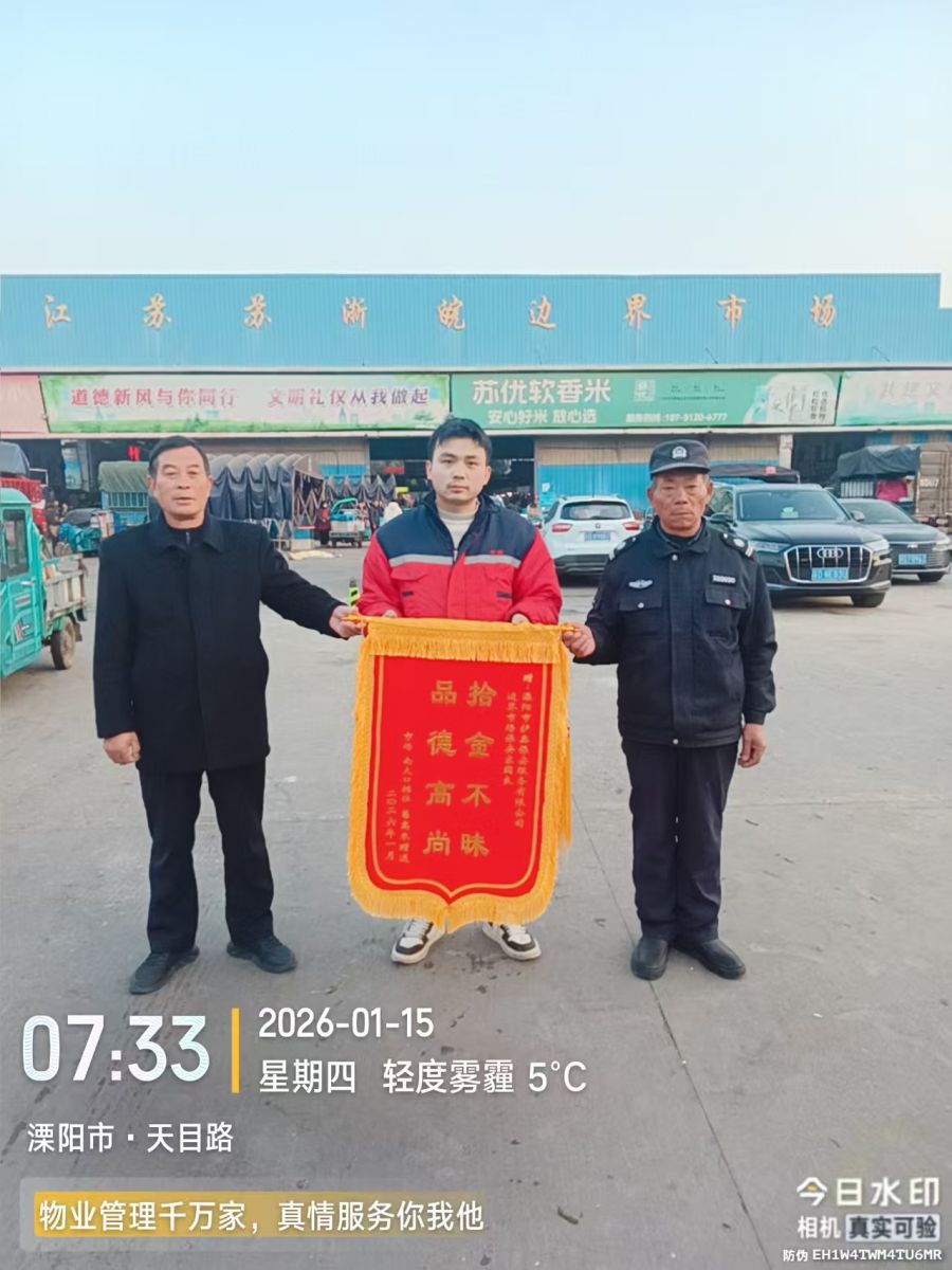 边界市场南广场摊主葛髙米在回家路途不慎将3970元现金丢失,市场保安宋国良在执勤時拾到,通过监控寻找到失主,及時如数交给失主,为了失而复得,特送锦旗一面,赠送护鑫保安公司(边界市场保安)表示感谢